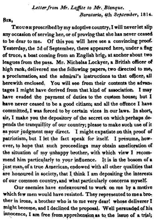 Jean Lafitte's letter to Jean Blanque, who served in the state legislature, to ask him to contact Claiborne and show him the British letter .