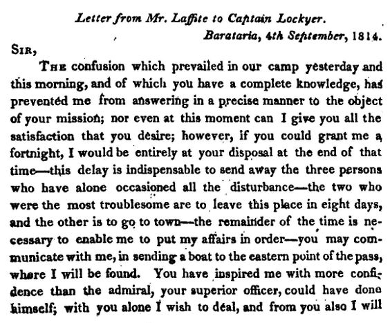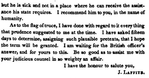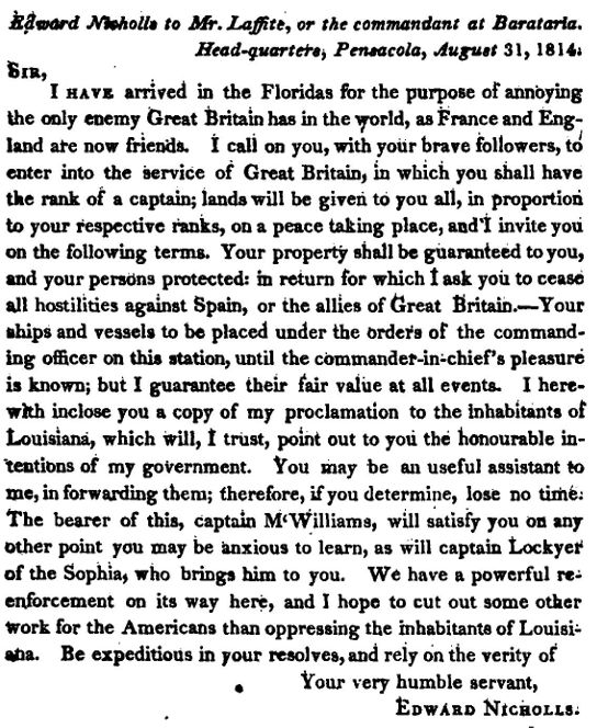 Letter from Colonel Nicholls to Lafitte Click for larger image . From Historical memoir of the war in West Florida and Louisiana in 1814-15 Latour